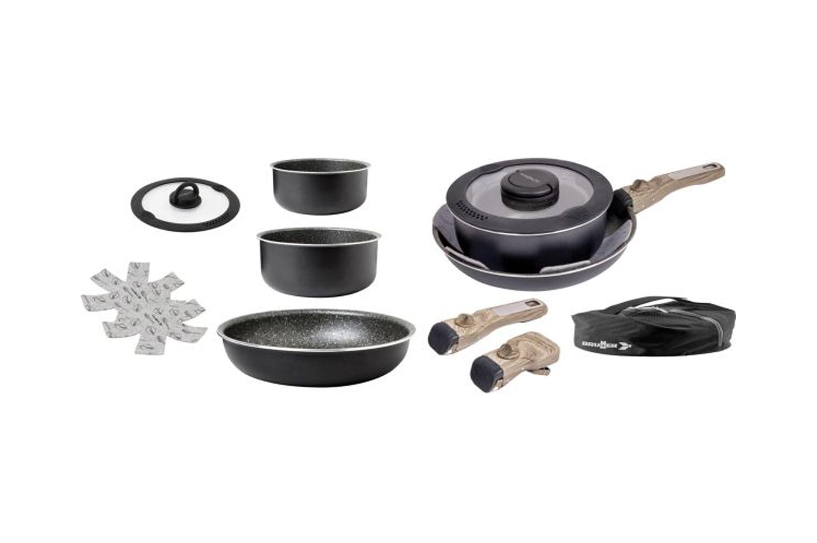 Zaradi svoje kompaktne zasnove je komplet idealen za shranjevanje v omejenih prostorih, kot so kuhinje v avtodomih, prikolice ali majhne kuhinje. Sodoben dizajn posod ne zagotavlja le estetske privlačnosti, ampak tudi funkcionalnost, saj so posode oblikovane tako, da se enostavno čistijo.