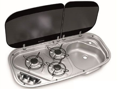 Vgradni kuhalnik-korito z elektronskim varnostnim vžigom, s steklenim dvojnim pokrovom odpornim na toploto in luknjo za pipo (Ø 39 mm), ki ni priložena. Moč gorilnikov: 4,8 kW, višine 14,7 mm.