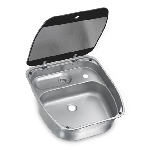 Korito Dometic z modernim steklenim pokrovom (temperaturno odporno). Manjše korito zadaj, odtok tip A je vključen v ceno. Za armature premera 27 mm.