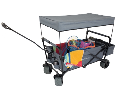 Praktičen voziček z jekleno konstrukcijo. Izredno uporaben v kampu, če ni mogoče parkirati zraven šotora ali za "odpravo" na plažo. Izjemno dovršena zasnova. 10 cm široka kolesa za nepogrezanje. Prenese obremenitve do 75 kg. Voziček ima dvoje držal za pijačo in dodatno prostor za drobnarije.