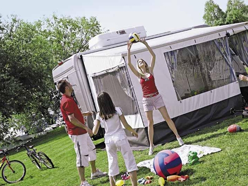 Hitra vezava na tendo - Fast Clip sistem. Sprednja stranica je iz enega kosa in lahko služi tudi kot podaljšek tende.