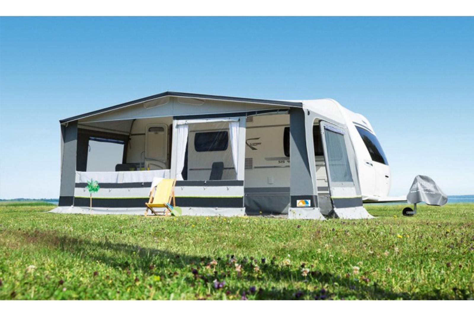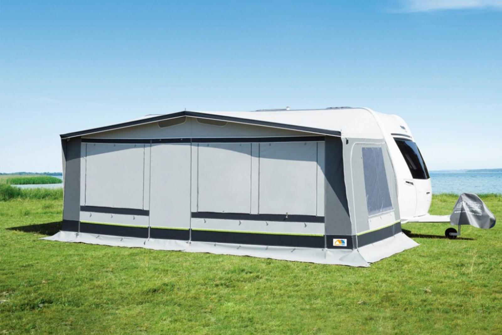 Sprednja stena z okenskimi zavihki je narejena iz tkanine trailtex (Airtex, Light-Tex), ki je zelo lahka in zračna tkanina, streha pa je Ten Cate All Season.