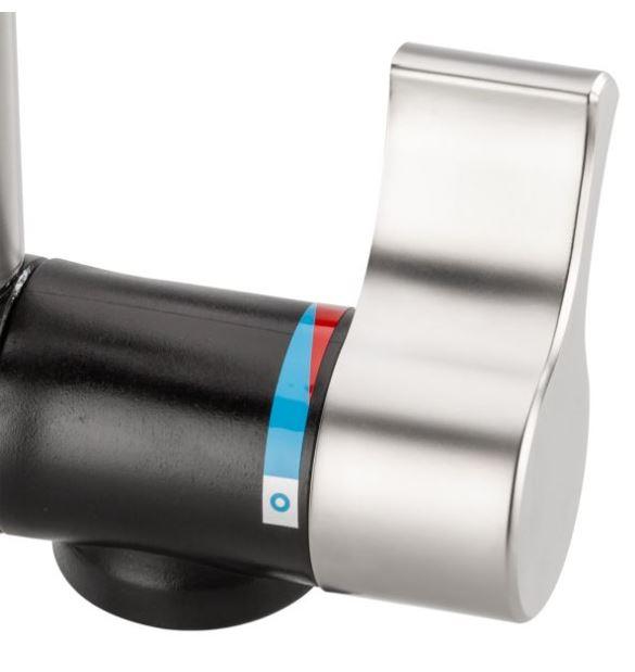 Mešalnik ima en ročaj, s katerim lahko enostavno uravnavate temperaturo in pretok vode. Z enostavnim premikanjem ročaja lahko dosežete želeno temperaturo vode in jo enostavno izmerite. Poleg tega je mešalnik opremljen s sodobnim in elegantnim dizajnom, ki se lepo prilega vsem stilom kopalnice.