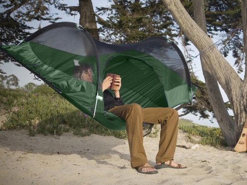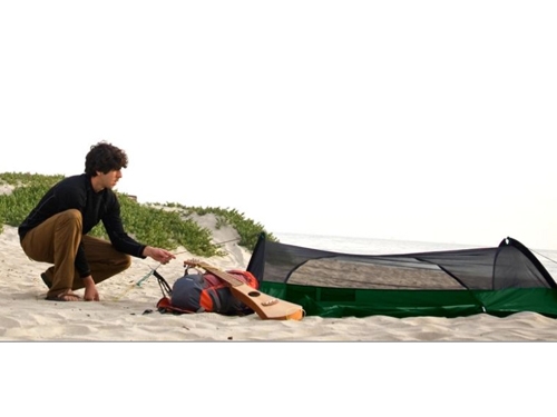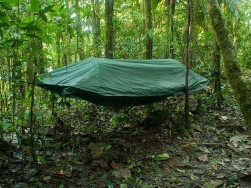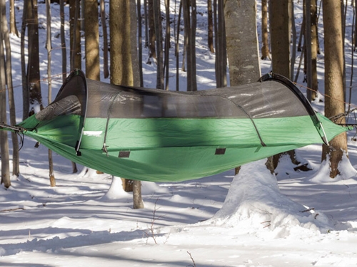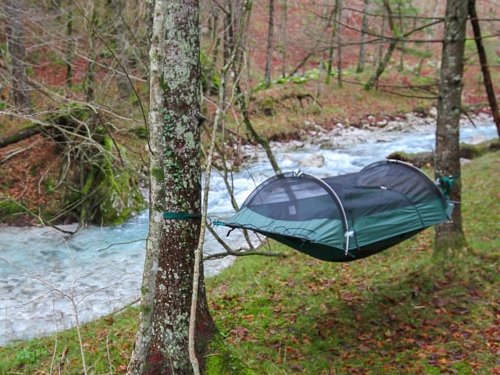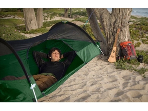 Vodotesen zunanji šotor z varjenimi šivi, ki se pritrdi na visečo mrežo (dodatna drevesa/količki niso potrebni)