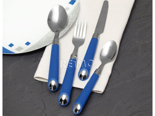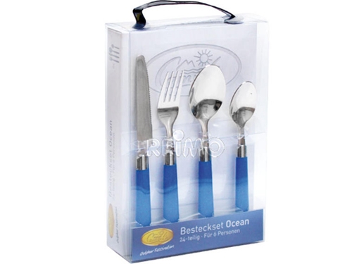 Jedilni pribor za šest oseb iz kakovostnega nerjavečega jekla (10/18). Sestavljen iz 6x: nož, žlica, kavna žlička in vilica.