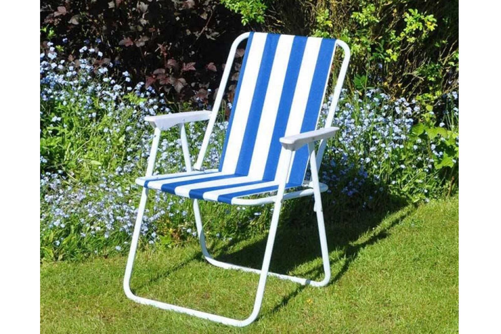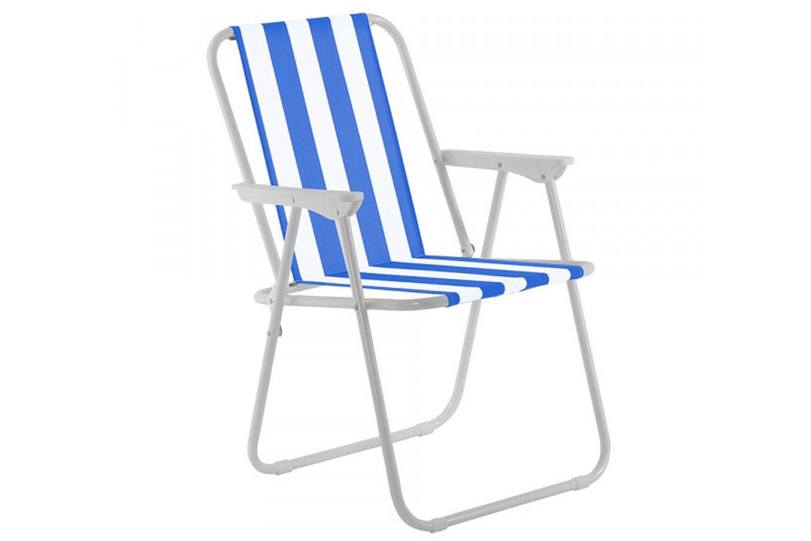 Klasični mini stolček z modrimi črtami. Nosilnost 80 kg. Narejeno iz tekstilnega materiala (textile) in kovine.