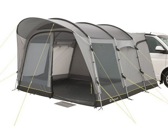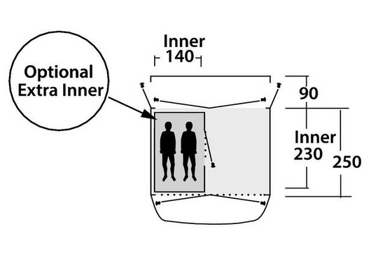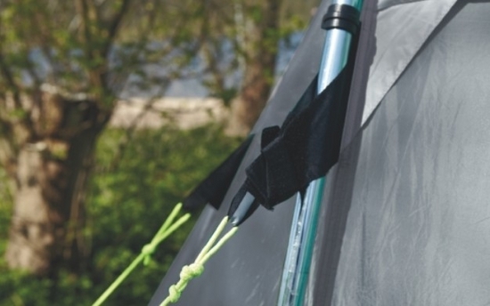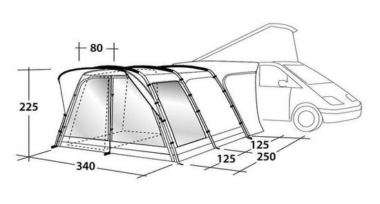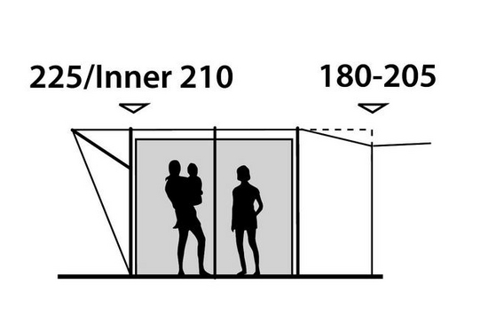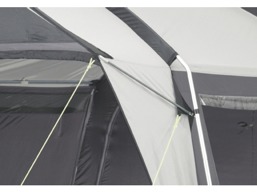 Velika stranska okna (z zavesami) dajejo občutek zračnosti, spredaj ima šotor nadstrešek, ki nudi zaščito vhoda za deževne dni. Vključeno dno z 10.000mm vodnega stolpca, ki se lahko ostrani (zadrga).