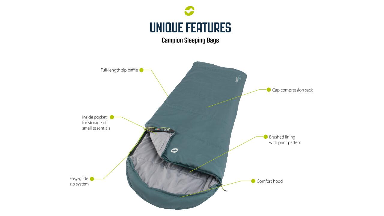 Zagotovite dodatno toploto po odlični ceni z vrečo za spanje Outwell Campion Lux. S svojo drugo plastjo izolacije je Campion Lux idealen za kampiranje malo izven sezone ali če se odpravljate na sever poleti. Ta različica je na voljo v šik petrol modri barvi, je zračna, mehka in prijetna. Pravokotna oblika zagotavlja dodaten prostor za noge, in tu je tudi notranji žep za drobne predmete.