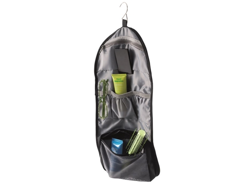 Praktična torbica za osebno higieno. Ima kavelj za obešanje, odstranljivo ogledalo z zaščito, 2 mrežasta žepa, 2 žepa na zadrgo in 4 majhne žepke.