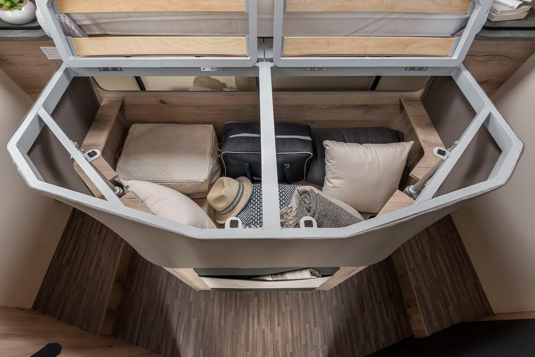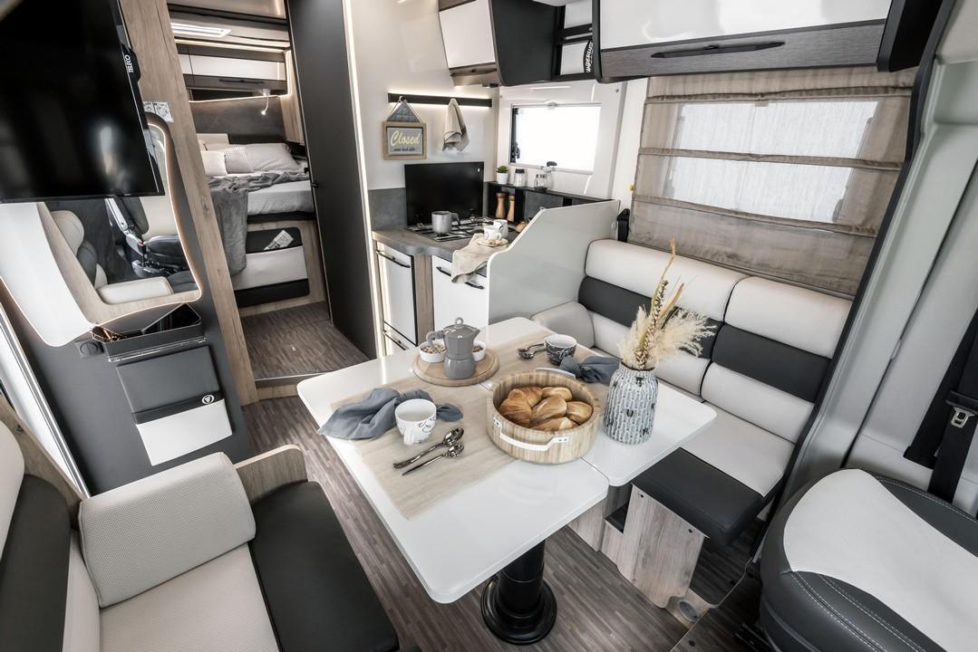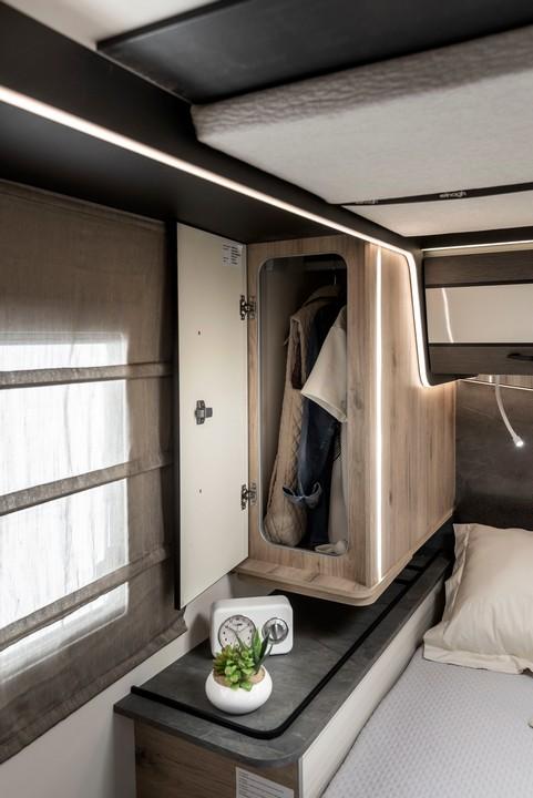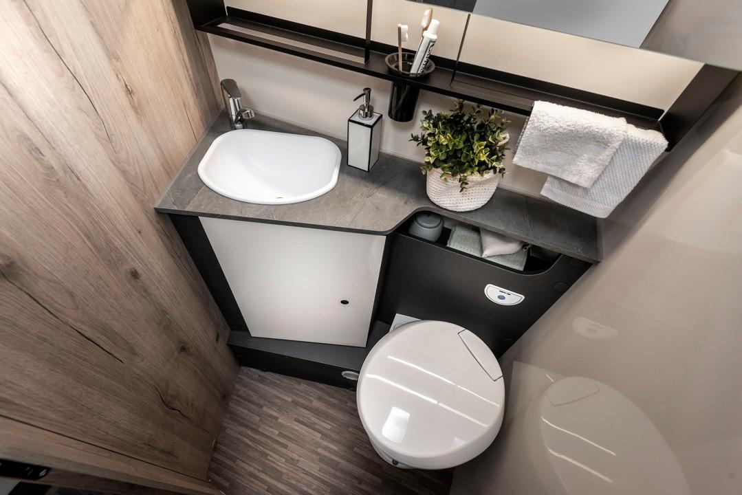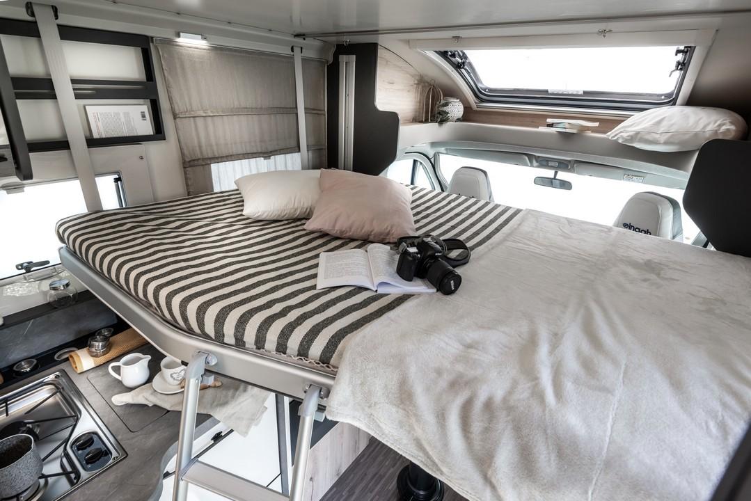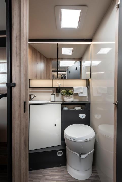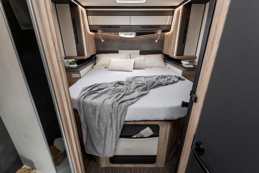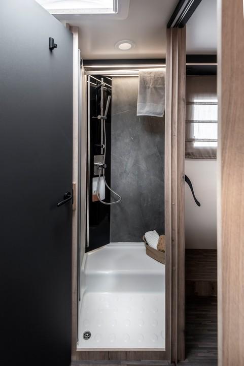 Avtodom T-Loft 582 s francosko posteljo in ločeno tuš kabino od WC-ja.