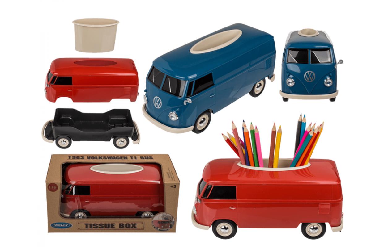 Prikupna škatla za papirnate robčke, nosilec telefona oziroma pisal v dizajnu VW T1 kombi vozila iz leta 1963. Dolžine 26,5 cm. Tovarniško sortirane barve; modra ali rdeča.