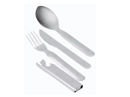 Potovalni pribor iz nerjavečega jekla. Vsebuje 1 nož, 1 žlico, 1 vilico, 1 odpirač steklenic in konzerv. Zložijo se skupaj v kompaktno obliko za potovanje.