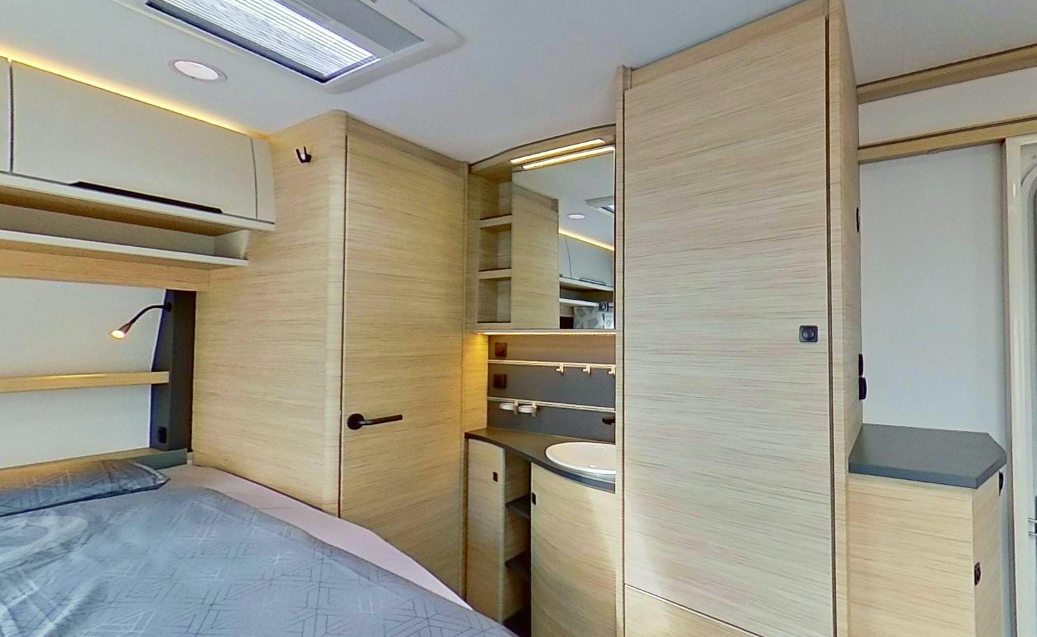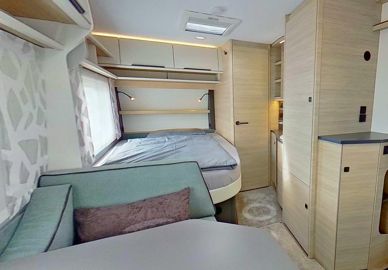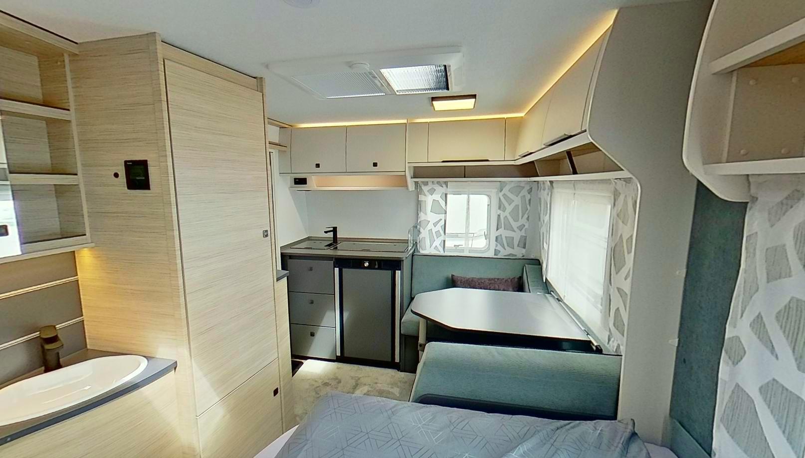 - LED 12V osvetlitev prostora z mizo in sedeži, osvetlitev nad omaricami v spalnici in jedilnem delu.