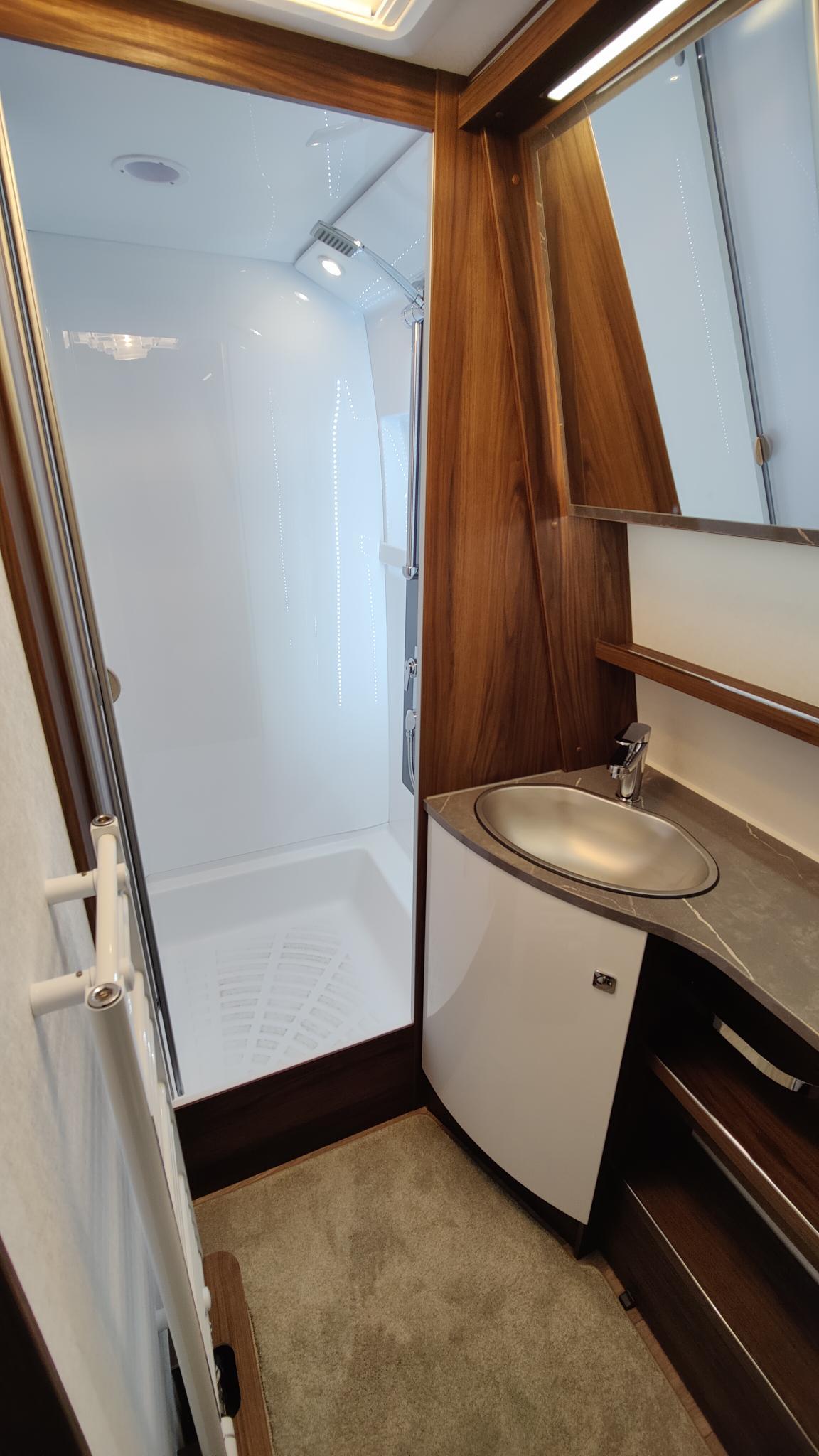 V zadnjem delu je prostorna kopalnica s samostojno tuš kabino.