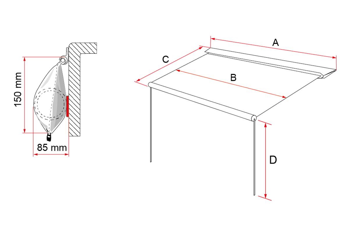 Model   Dolžina tende A Dolžina platna B Izvlek C Max višina D Površina sence Masa