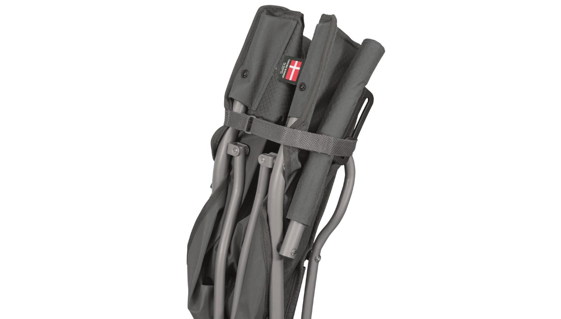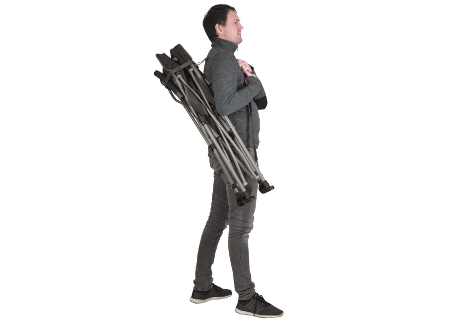 Izdelan je iz trpežnega jekla, s širokim podnožjem, ki zagotavlja dodatno stabilnost na različnih podlagah. Stol je enostavno zložljiv in ga je mogoče hitro pripraviti za uporabo ali pospraviti. Za priročno prenašanje je priložen nastavljiv ramenski trak.