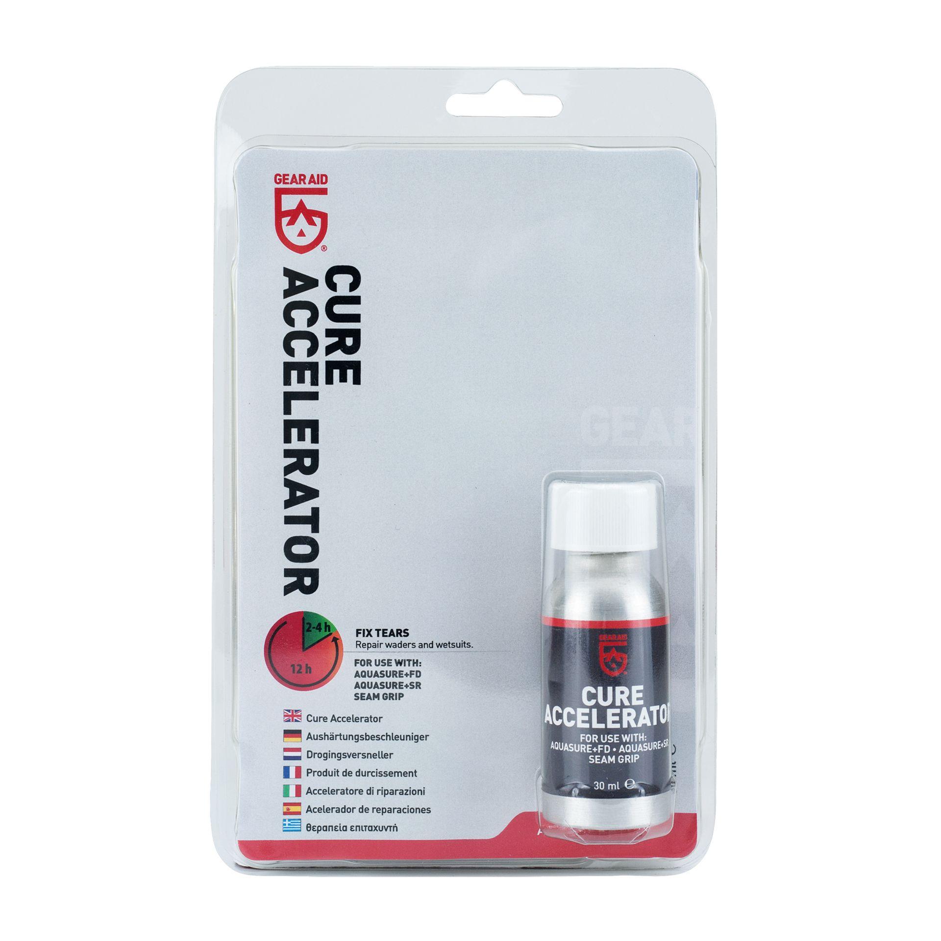 Gear Aid Cure Accelerator omogoča uretanskim lepilom, vključno s Seam Grip+WP, Aquasure+FD in Aquasure+SR, da se hitreje strdijo in pripravi gladke površine za boljše lepljenje.