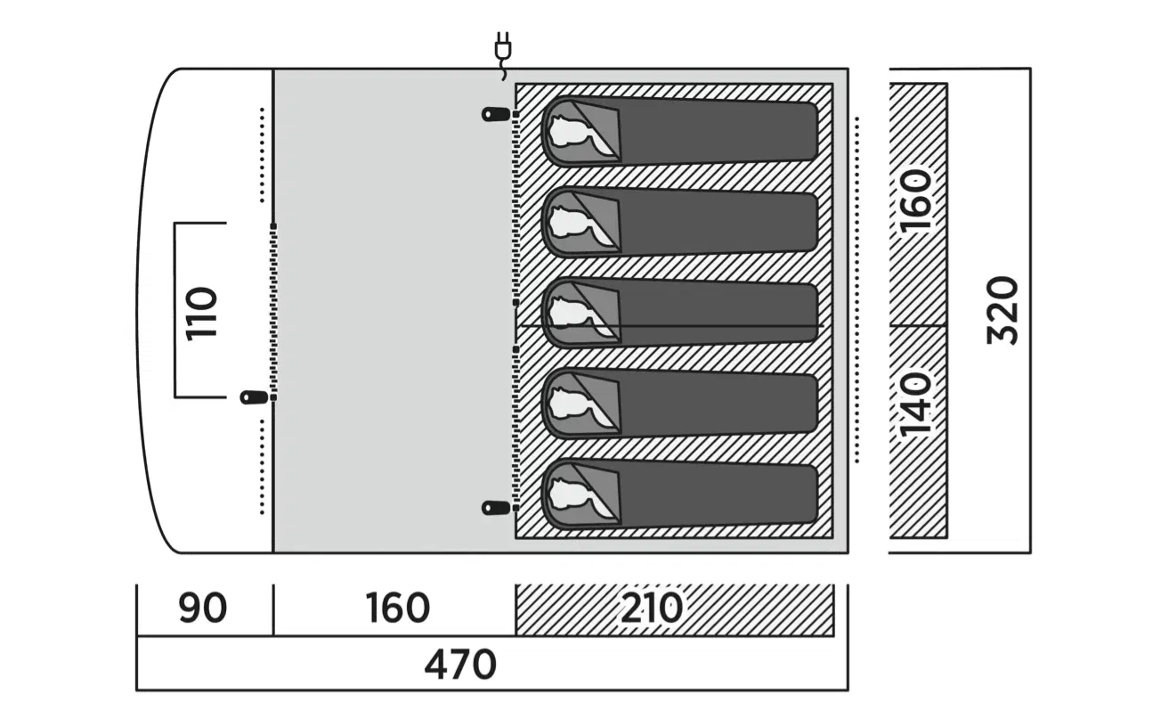 Velik bivalni prostor je idealen za obedovanje, družabne igre in sproščanje po aktivno preživetem dnevu. Šotor nudi učinkovito prezračevanje, ki ohranja notranjost svežo, všita talna ponjava pa ščiti pred prepihom in insekti. Temnejše spalnice zmanjšujejo vdor svetlobe ter omogočajo miren in udoben spanec.