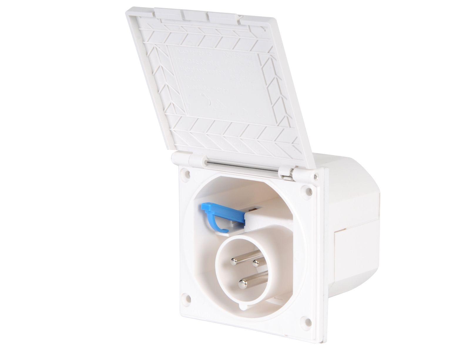 Kvadratna vhodna CEE vtičnica s pokrovom bele barve.