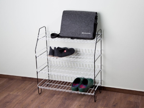 Praktičen in lahek regal za do 12 parov čevljev. Priročen in stabilen. Enostavna montaža in shranjevanje. Štiri nadstropja. Narejene iz žice prevlečene z plastiko. Dimenzije postavljen; 64 x 33 x 74(v) cm.