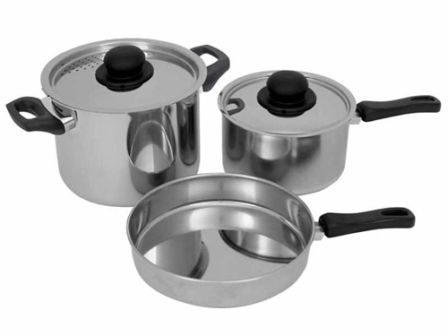Set posod iz jekla visoke kakovosti. V kompletu je: 1 lonec (18 cm premera), 1 ponev za cvretje ( 20 cm premera), 1 nižja posoda (16 cm premera) in 2 pokrovki (18 in 16 cm premera) in 2 držala.