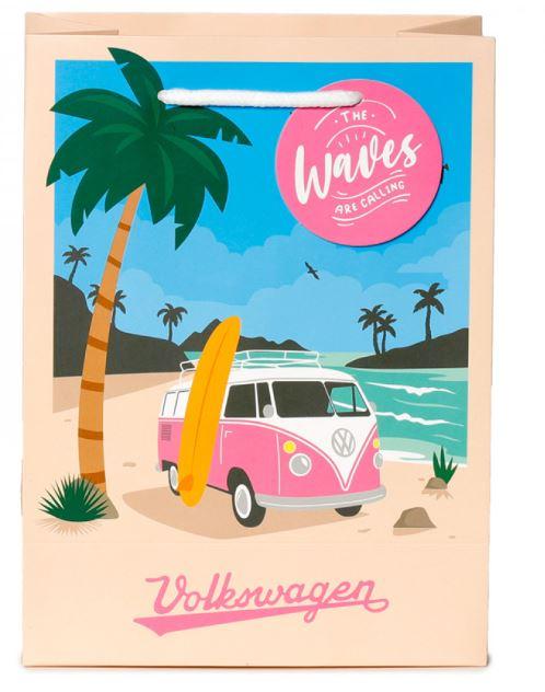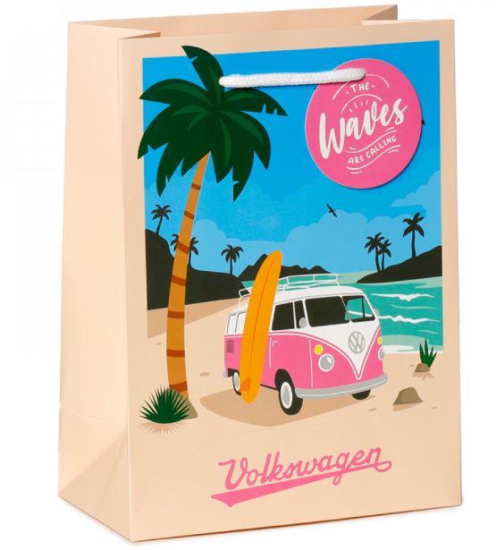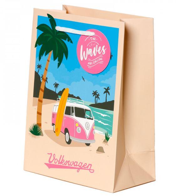 Medium Volkswagen VW T1 Camper Olas Caravan Gift Bag" je stilna darilna vrečka z retro motivom Volkswagen T1 Camper Van. Narejena je iz trdnega papirja s težo 200 gramov, kar ji daje vzdržljiv in kakovosten občutek, kar je idealno za shranjevanje daril.Je posebej zasnovana za ovijanje ali prenašanje daril na zabaven in dekorativen način. Njena srednja velikost je primerna za darila, kot so knjige, oblačila ali druge srednje velike predmete, medtem ko dizajn z avtodomom doda pridih nostalgije in šarma.