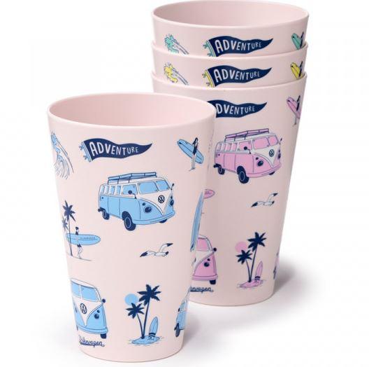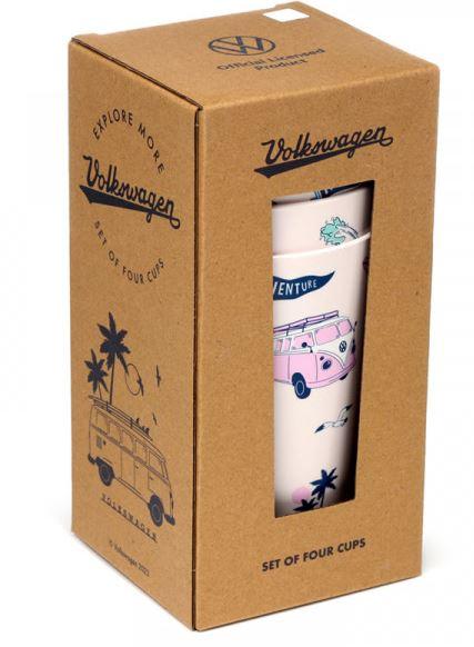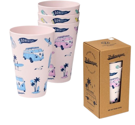 Ta komplet štirih kozarcev, zasnovan za uporabo na prostem, je narejen iz RPET materiala, ki je trajnostna alternativa tradicionalni plastiki. Kozarci so primerni za piknike, kampiranje ali druga zunanja srečanja. Oblikovani so v stilu legendarnega VW Volkswagen T1 Camper Explora, ki dajejo pridih avanturističnega duha in retro estetike.