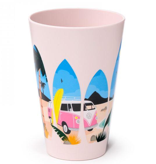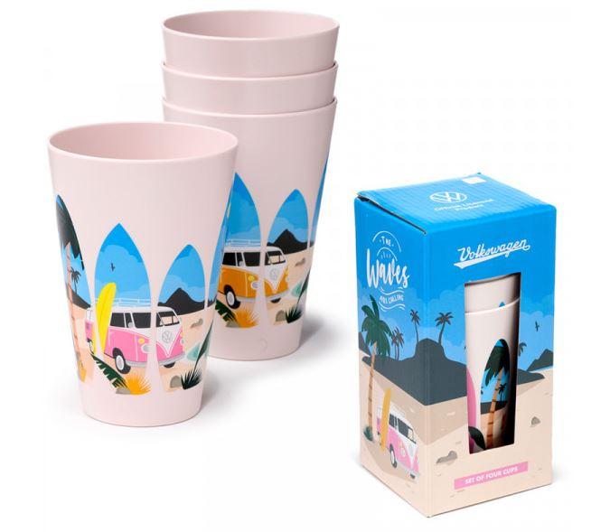 Komplet vsebuje štiri kozarce za piknik, okrašene z motivom karavane VW Volkswagen T1 Camper. Kozarci so izdelani iz RPET (recikliranega polietilen tereftalata), kar pomeni, da so okolju prijazni in trpežni.