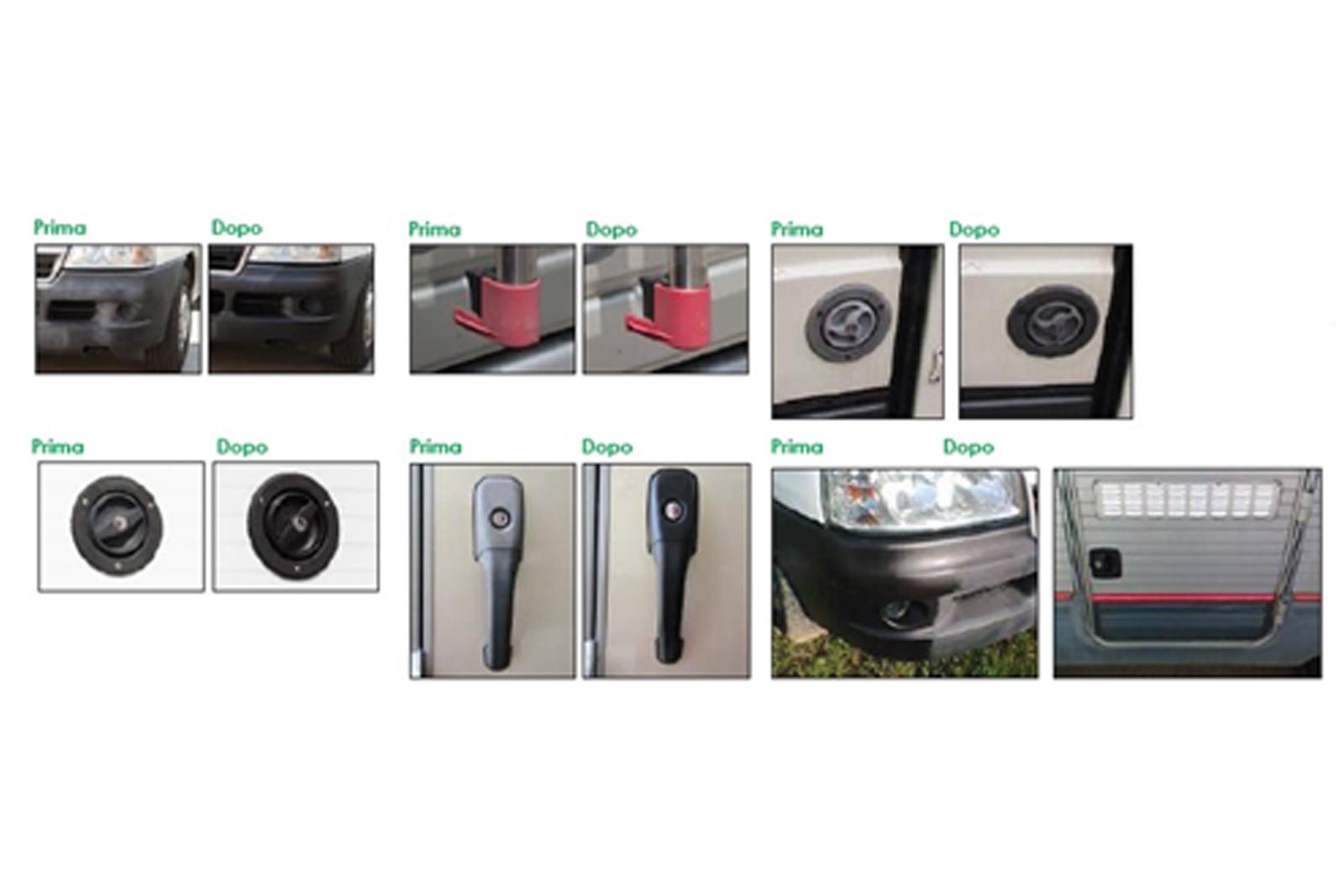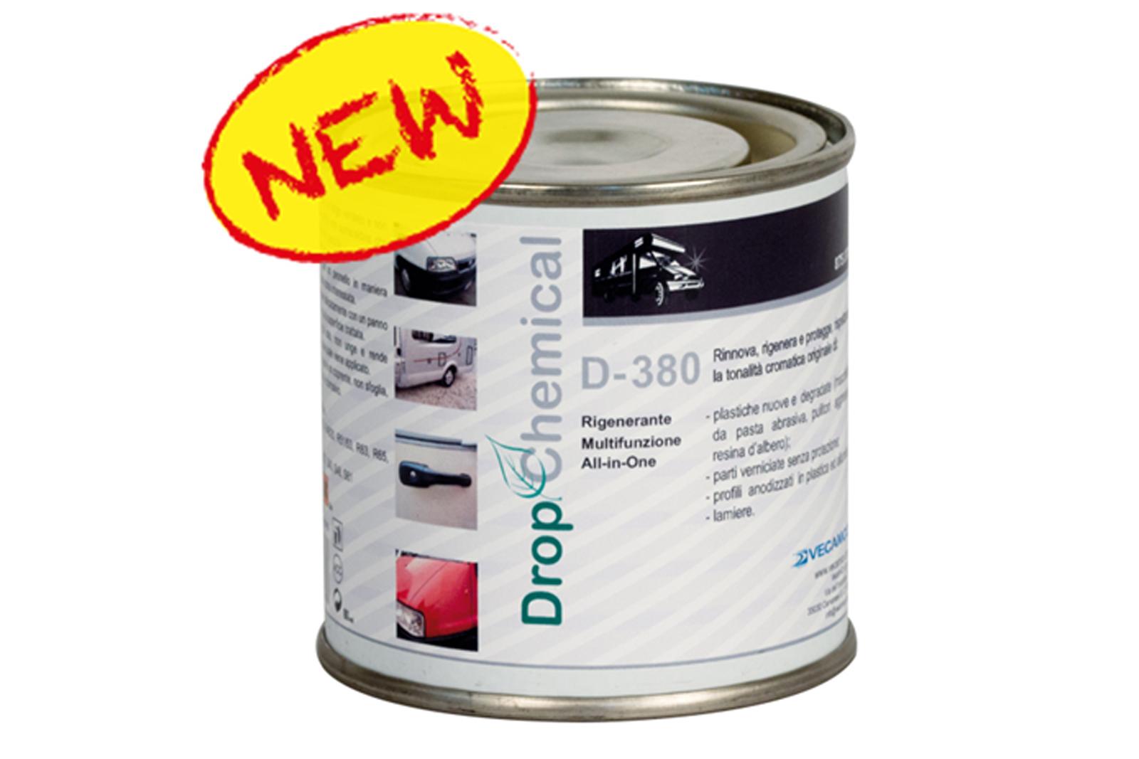 Patentiran izdelek, narejen v Italiji, obnavlja in ščiti kose na avtodomu in prikolici. Uporaba brez silikona in topil, preprosto nanesemo s čopičem in vtremo z mehko krpo. Odstranjuje umazane in zblede površine iz plastike, pločevine in aluminija tar jim povrne prvotno barvo. "All-in-one D380" se hitro suši in ima vodoodbojni učinek do 12 mesecev. Ni jedek in nima rok trajanja. Cena za 80 ml.